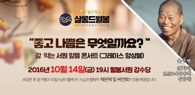 지난 10월의 ‘살롱 드 월봉’은 철학자 윤구병 선생을 모시고 ‘참과 거짓, 좋음과 나쁨’에 대한 마음결 철학 강연의 자리로 마련되었습니다. 성균관유도회가 준비해주신 꽃차와 다과, 그레이스앙상블의 달빛 아래 클래식 공연, 윤구병 선생의 특강과 『스님과 철학자』 싸인회까지 관객들에게 잊지 못할 특별한 서원의 밤을 선사했는데요. 2011년 시작 이후 짝수 달 셋째 주 금요일 오후 7시 정기 행사를 개최해 온 ‘살롱 드 월봉’은 12월 16일(금) 송년특집 행사를 앞두고 있습니다.