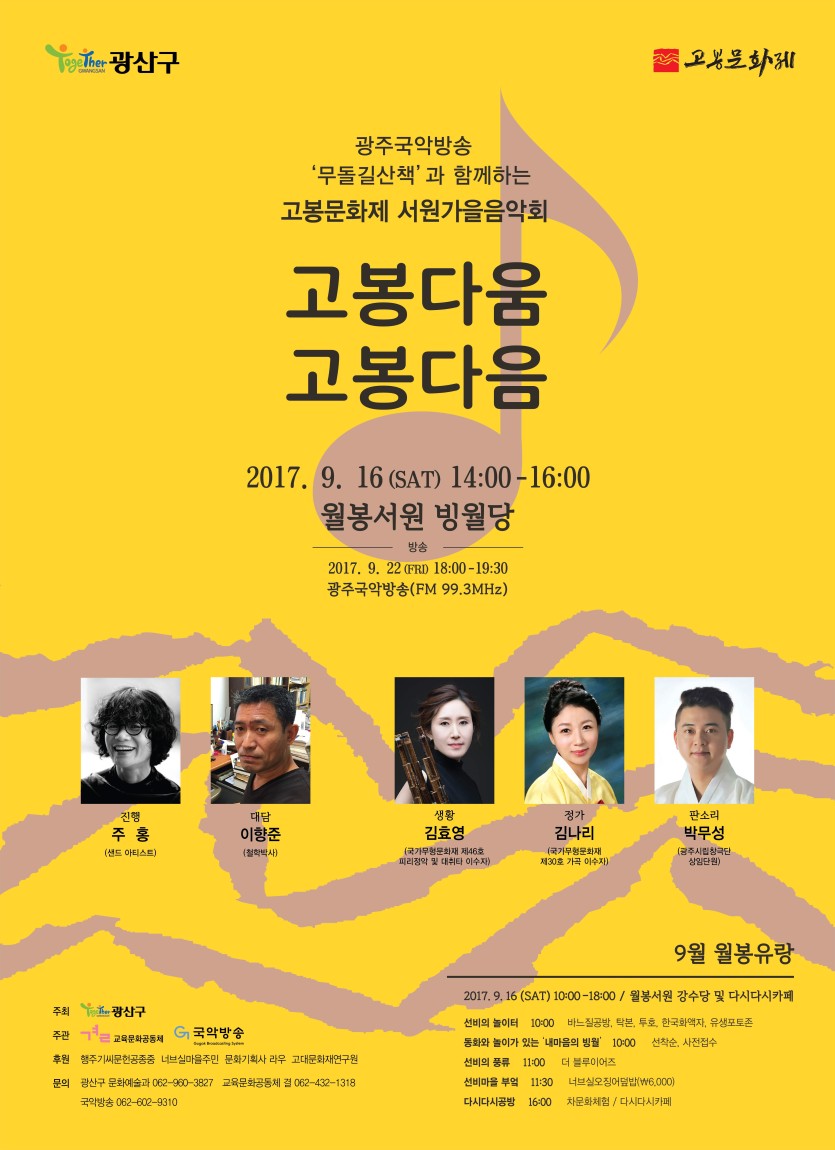 14:00~16:00 광주국악방송 무돌길 산책과 함께하는 고봉문화제(생황 연주,정가 공연,판소리 공연)