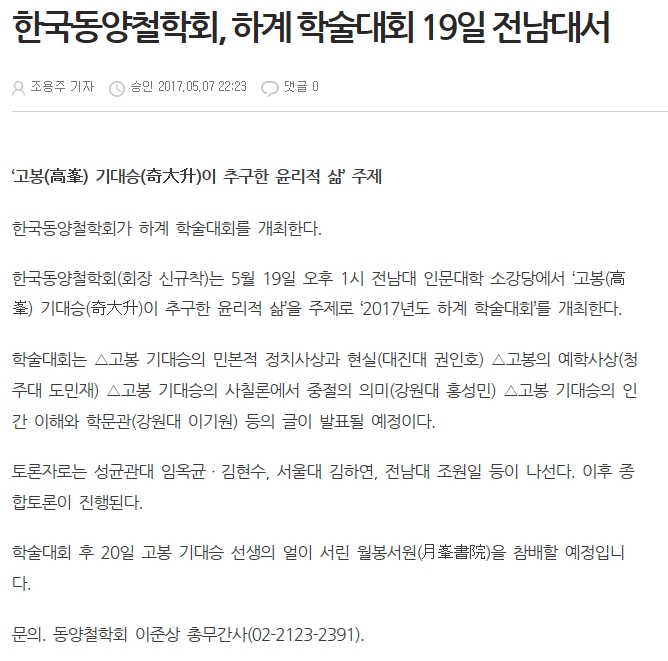 170507_한국동양철학회, 하계 학술대회 19일 전남대서